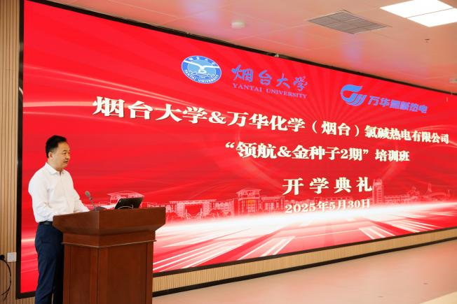 5月30日,万华化学(烟台)氯碱热电有限公司与烟台大学联合培养项目“领航&金种子2期”培训班开学典礼在烟台大学八角湾校区举办,化学化工学院、继续教育学院有关人员和参训学员共60余人参加活动。