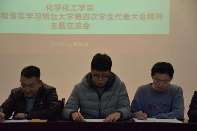 烟台大学第四次学生代表大会于2019年12月8日胜利闭幕,化学化工学院学生会于12月10日晚自发组织学院广大基层学生代表在化学馆三楼会议室深入学习校第四次学代会精神。院学生委员会秘书长陈俊羲老师、院学生会全体成员以及院基层学生代表参加本次学习交流会,院学生会副主席于海洋主持会议。