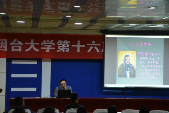 为了培养学生良好的读书兴趣,营造浓郁书香校园的文化氛围,引导学生走进经典、阅读经典,5月7日下午四点,由人文学院协办的烟台大学第十六届读书节系列活动之经典赏析讲座在逸夫报告厅顺利开展。本次活动邀请了人文学院院长、中国社会科学院高级访问学者、山东省美育专家资源库专家董晔老师主讲,董老师为师生们带来了题为“《论语》中的人生哲学”的精彩讲座。