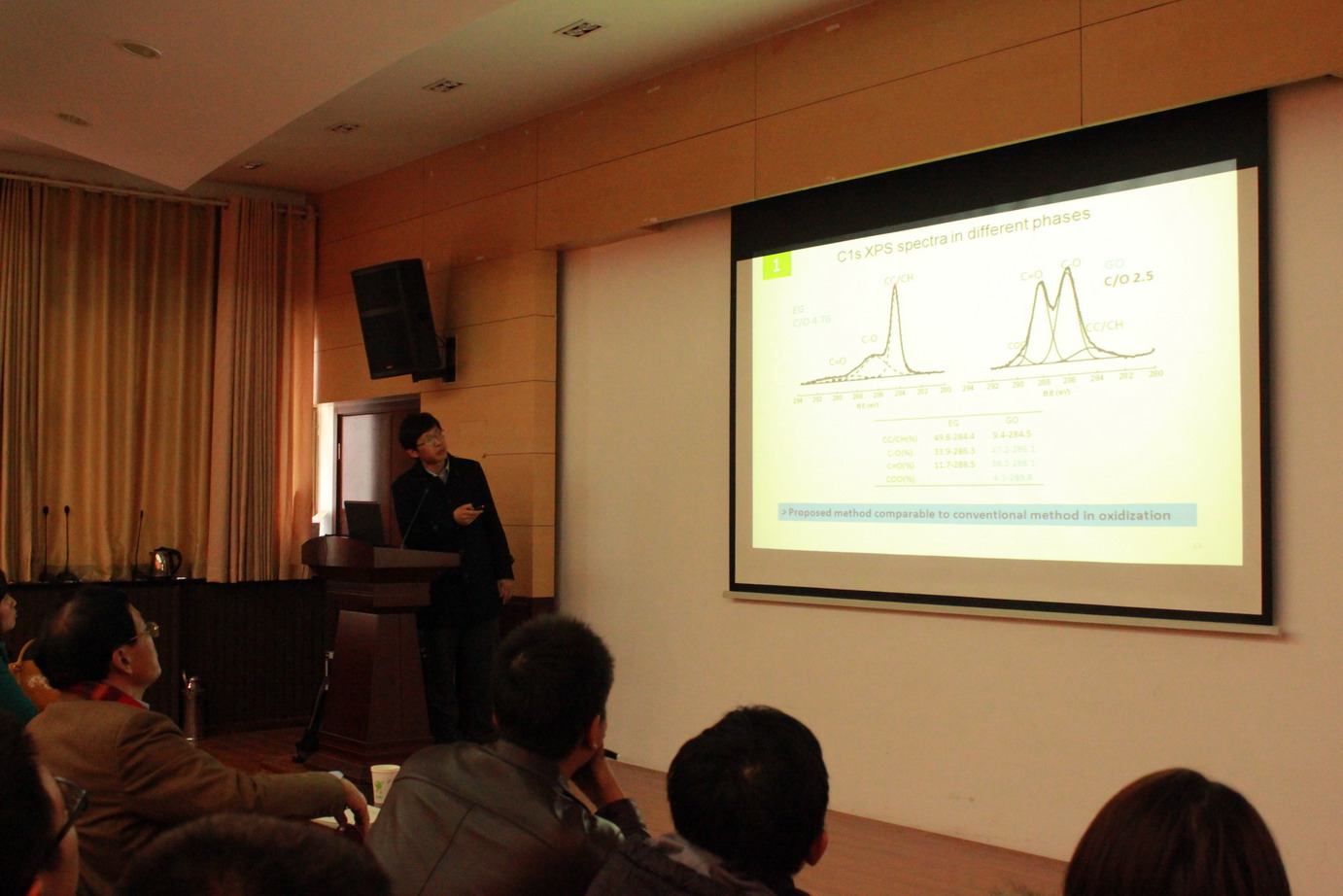 王延青博士详细为大家介绍了实用新型碳纳米复合材料──氧化石墨烯和石墨烯的合成技术以及纳米分散技术研究的进展重点介绍了水系单分散超长单壁碳纳米管制备柔性透明导电膜和柔性透明电极以及碳纳米复合材料在水污染处理和碳系新能源的的相关研究,并与大家分享了科研心得。多名教师、研究生就学术问题与王博士进行了交流,收到了很好的效果。