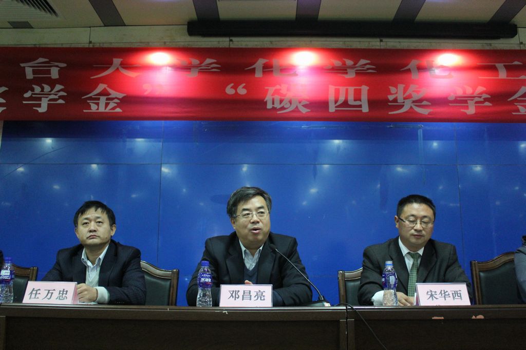 颁奖仪式上,学院副院长索掌怀、高原分别宣读了《化学化工学院关于颁发2011-2012年度“碳四”奖学金的决定》和《化学化工学院关于颁发2011-2012年度“泰达”奖学金的决定》。烟台泰达集团董事长宋华西先生向获得“泰达”奖学金的获奖同学颁奖并合影留念,与会领导向获得“碳四”奖学金获奖同学颁发了获奖证书,孙春阳同学和贾兵同学分别代表获奖学生发言。烟台泰达集团董事长宋华西先生以“不怕困难、不怕挫折、不怕出头、不怕失败、不怕吃苦、不怕低头“的“六个不怕”精神激励广大同学,要勇于面对困难,发奋图强,争做国家栋梁之才。随后,副校长邓昌亮发表讲话,他首先感谢泰达集团和碳四分离项目课题组的慷慨善举,在我校设立奖学金,并对化学化工学院的产学研相结合的工作成绩给予充分肯定,最后,他希望广大获奖同学要学会感恩,励志成才,争取更大、更好的成绩,为我校的建设和发展贡献自己的力量。院长任万忠介绍了设立奖学金的目的、意义,并对广大学生提出了要求和希望。
