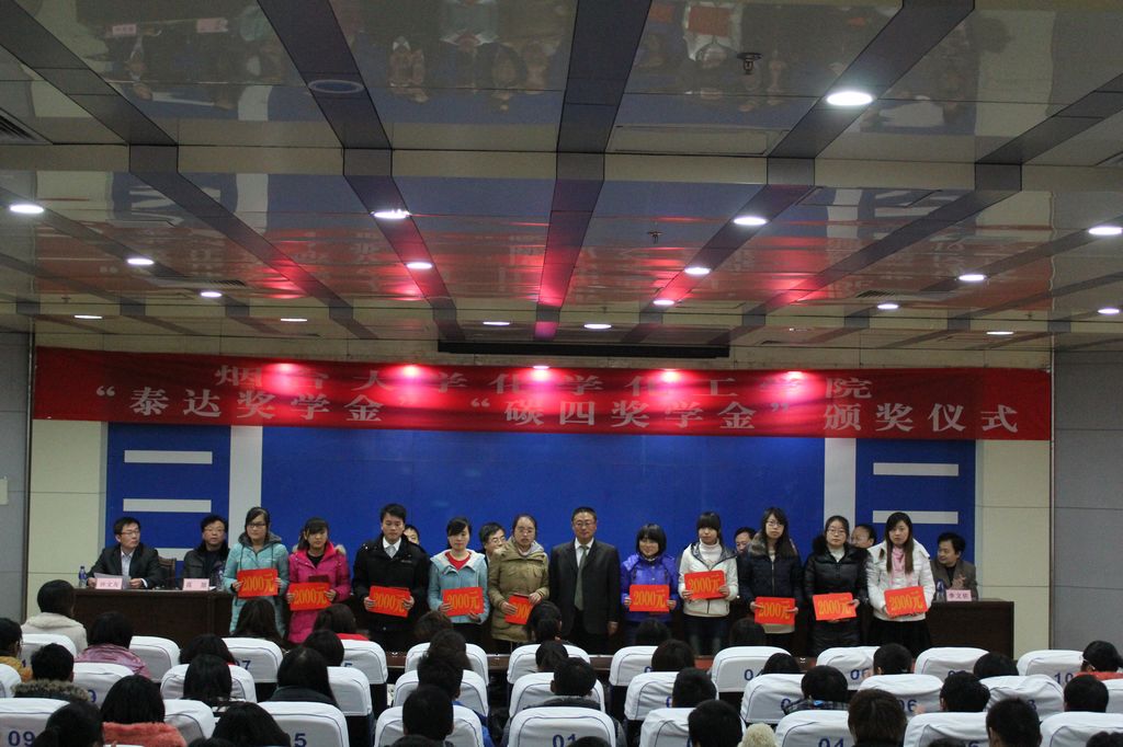 “泰达”奖学金是2012年5月由烟台泰达集团在化学化工学院正式设立,泰达集团出资50万元设立奖励基金,为期10年,每年划拨4万元用于“泰达奖学金”的发放。“碳四”奖学金是2012年7月由我院碳四分离课题组设立,碳四课题组出资30万元人民币,奖学金设定五年,每年6万元,用于奖励勤奋学习、勇于创新的化院本科生和研究生。