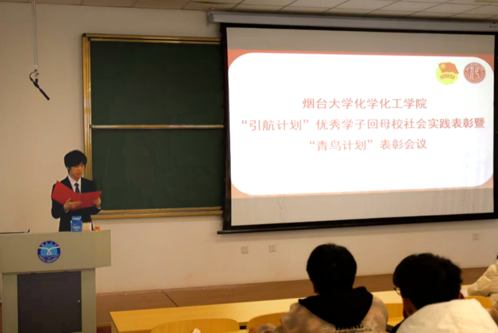 2025年3月19日中午,化学化工学院精心筹备,于八角湾校区一教101教室,隆重举办 “引航计划” 优秀学子回母校社会实践表彰暨 “青鸟计划” 表彰会议。此次会议旨在对在“引航计划” 中,以实际行动展现烟大风采,积极回馈母校、提升学校影响力的优秀学子,以及在 “青鸟计划” 里踊跃贡献力量的学生进行公开表彰,激励广大师生在未来更好地投身于各项实践与发展计划之中 。