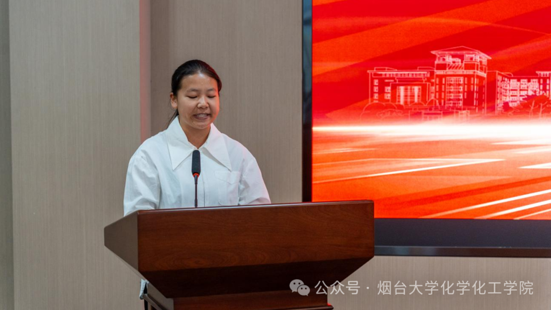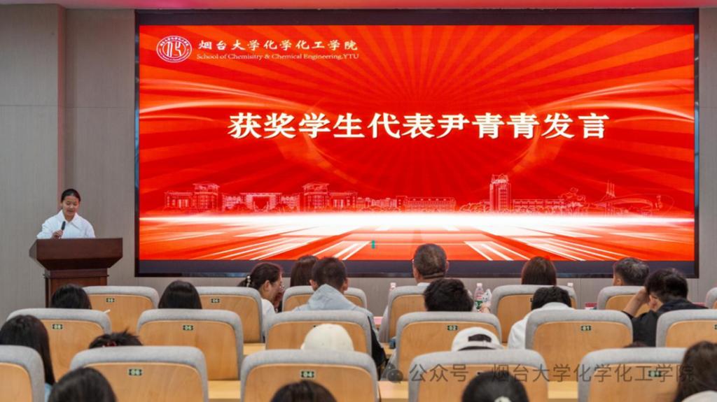 典礼上,获奖学生代表尹青青分享了她的获奖感言,她以“心怀热爱,奔赴下一场山海”为题,分享了她在大学期间面对学习难关,用自律与坚持攻克一个个学习上的难题;身为学习委员,她投身知识传递,并担任“学生讲师团”小导师,向同学传授学习经验。这份荣誉不仅是对她过往努力的见证,更是对未来探索的激励。今后她将化荣誉为学习的动力,在化学领域精耕细作,用所学知识为社会发展添砖加瓦,向着更高峰勇敢攀登,展现新时代大学生的使命担当。