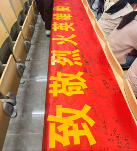 这一刻,笔尖划过的不只是布帛,更是一份沉甸甸的承诺与责任。每一个签名都代表着化院学子对消防英雄的崇高敬意,也彰显着大家共同维护校园安全的坚定决心。