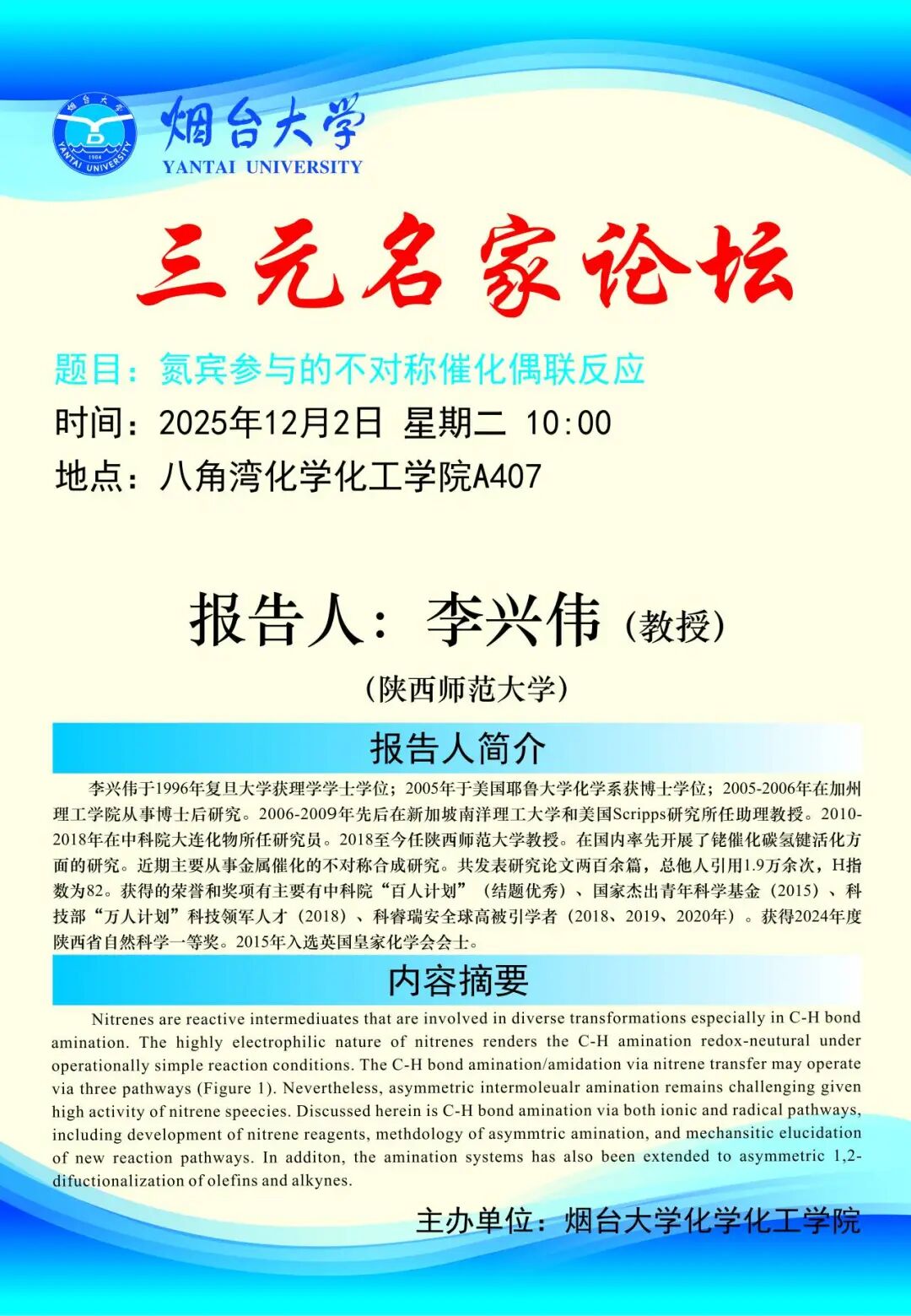 学术交流 | 三元名家论坛——氮宾参与的不对称催化偶联反应