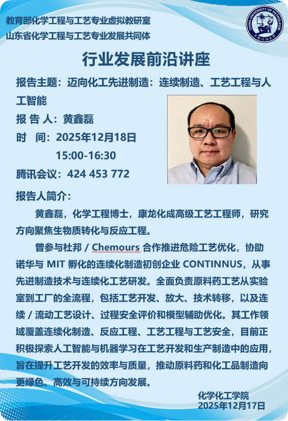 学术交流 | 行业发展前沿讲座——迈向化工先进制造:连续制造,工艺工程与人工智能