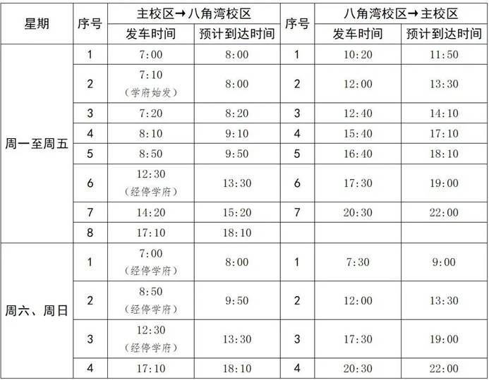 根据学校教学工作安排,现将新学期八角湾校区班车运行方案通知如下: