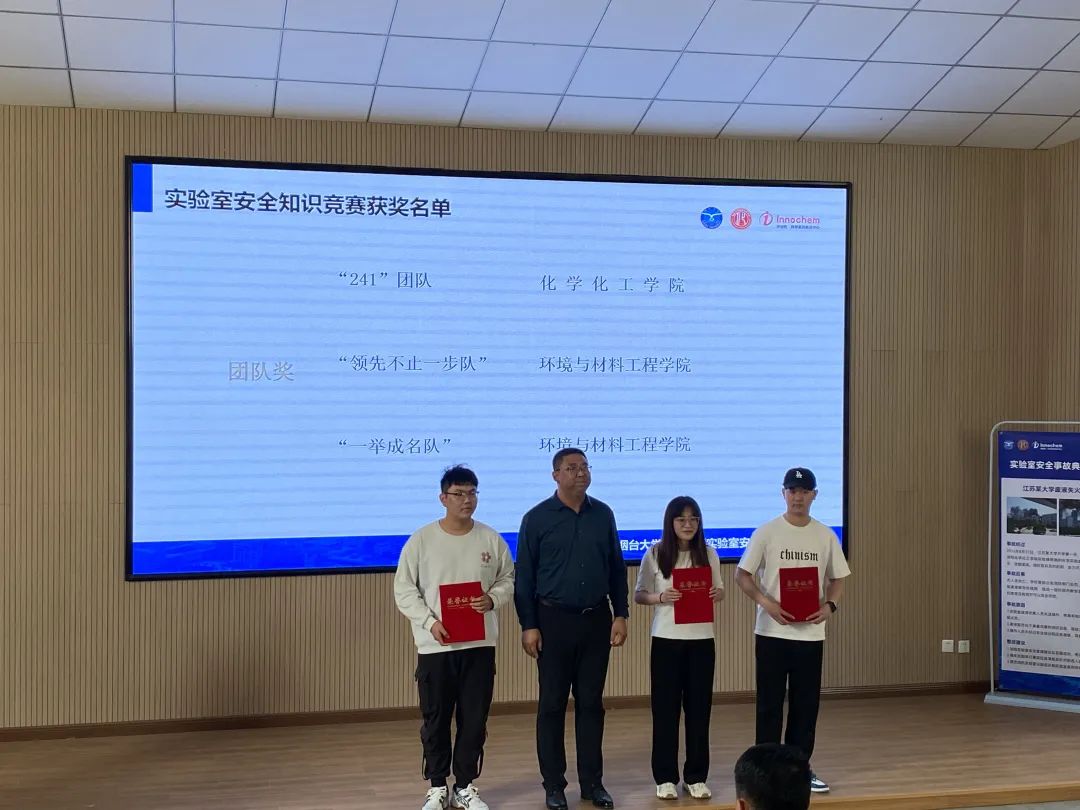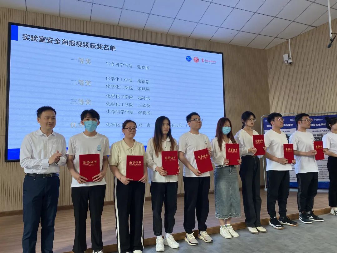 随后,李文佐院长、林立成书记、梁入文副处长为本届“实验室安全月”子活动——实验室安全宣传海报、视频创意设计大赛,实验室安全问题整改清单征集、评比活动,实验室安全知识答题赛进行颁奖。获奖同学化学化工学院2021级研究生褚福浩激动地说:“我们组队参加了视频设计大赛,在参赛过程中我们更加关注实验室安全细节,希望更多同学能够关注到我们的视频,注意实验安全,做好个人防护。”