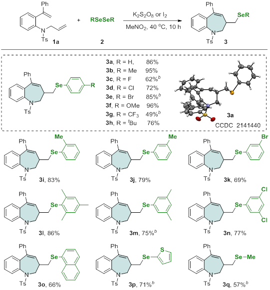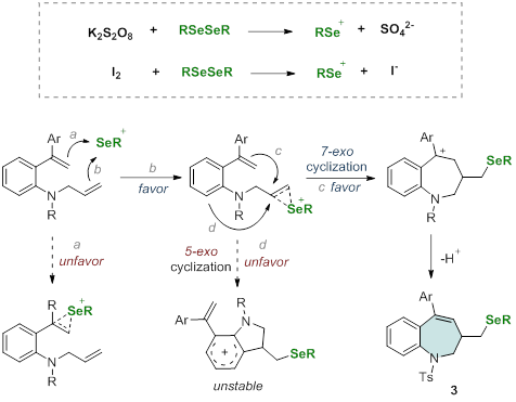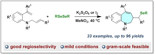 有机硒化合物,尤其是硒杂环化合物,因其在医学和材料科学中具有显著的应用价值而被广泛研究。目前,已有多种构建硒杂环化合物的方法相继被探索和报道。其中,由二硒醚化物促使的环化反应是最具代表性的一种策略。然而,该领域所涉及的反应主要集中在构建具有5元或6元环的杂环产物,而专门用于构建 7 元硒杂环的方法很少报道。在仅有的几例报道中,主要以芳基-炔烃类结构为底物,反应中或需要化学计量的金属氧化剂(FeCl3),或受到二芳基二硒化物的限制(仅有二苯基二硒化物研究),进一步影响了反应的实际应用。