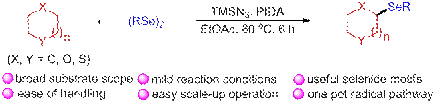 含硒杂环化合物重要的生物和药理活性,以及在抗菌、抗肿瘤、心血管保护及免疫调节方面的重要作用。孙凯课题组利用PIDA/TMSN3氢原子转移体系,成功实现了醚类化合物的直接C(sp3)-H硒化反应,制备了系列结构多样性的不对成硒醚化合物。(Chem. Commun., 2022, 58, 1526)。