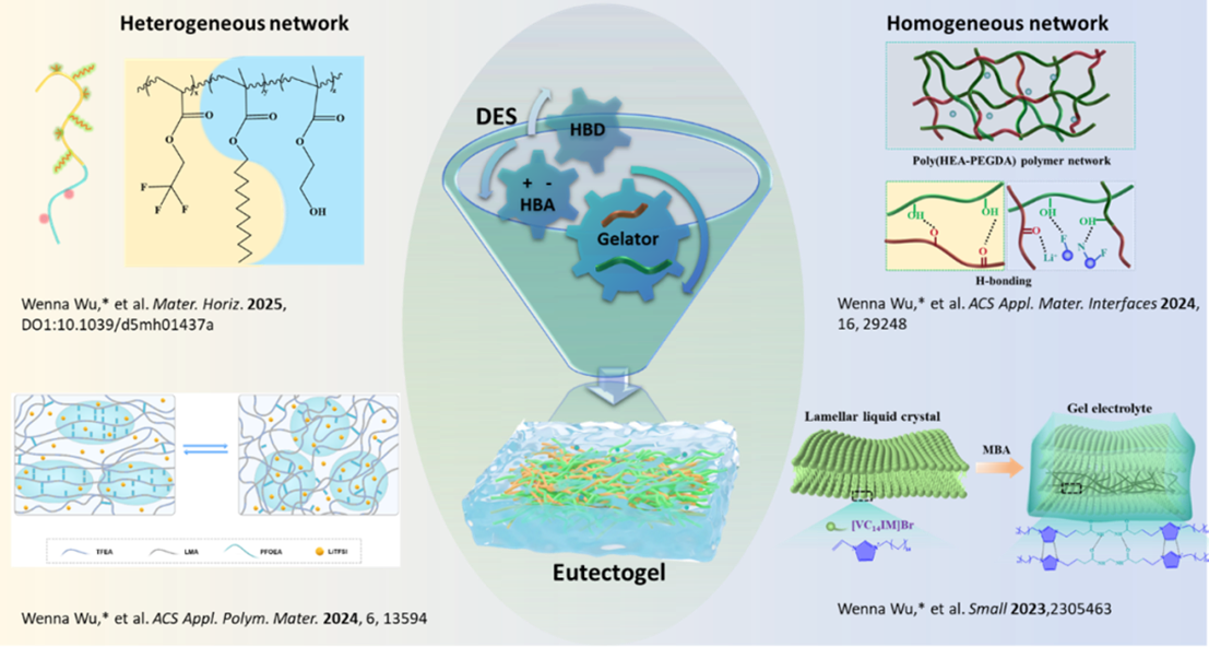 低共熔凝胶是近年来出现在凝胶家族中的一类新型软材料,由三维交联网络和低共熔溶剂(DES)形成。低共熔溶剂作为一类新型绿色溶剂,由2种或2种以上的化合物(Lewis或Brønsted酸和碱)通过氢键形成,具有制备简单、挥发性低、可燃性低、导电性好等优势,故以其构筑的低共熔凝胶呈现水凝胶、有机凝胶、离子液体凝胶等无法比拟的独特性能。DES具有强的可设计性,这意味着其物理化学性质可通过选择适当的对应组分进行微调。目前已有疏水型、可聚合型、天然型、超分子型低共熔溶剂被相继报道,利用这些性质各异的DES构建成低共熔凝胶并不断发展多功能体系的研究取得了一些重要进展。
