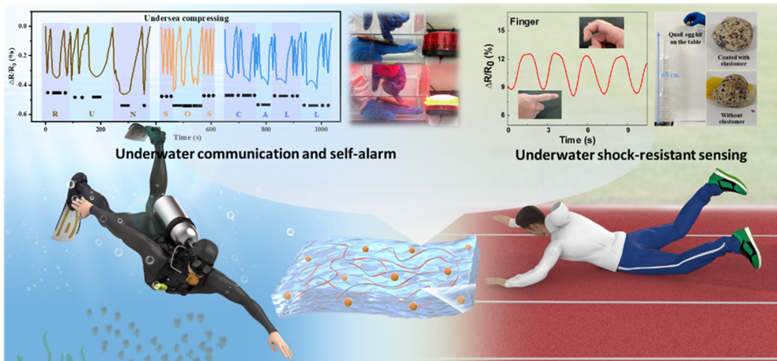 此外,作者还在疏水网络中制备了一种具有异质两相结构的自阻尼离子凝胶。含氟聚合物之间独特的自组装行为使相分离更容易发生,从而将阻尼和弹性功能解耦到两个不同的相中,实现了抗冲击和抗噪声干扰能力的人体运动感应和水下通信。