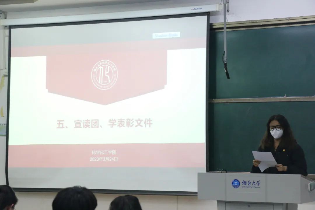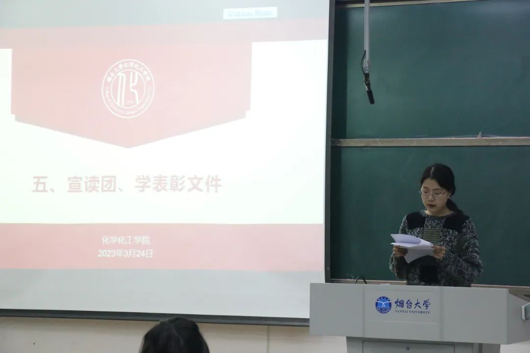 随后,赵锦泽老师和赵颖老师分别代表院团委、院学工组宣读了化学化工学院共青团表彰文件和学生服务教育管理工作表扬文件,表彰了在上学期在学院学工工作中表现优异的学生集体和个人。