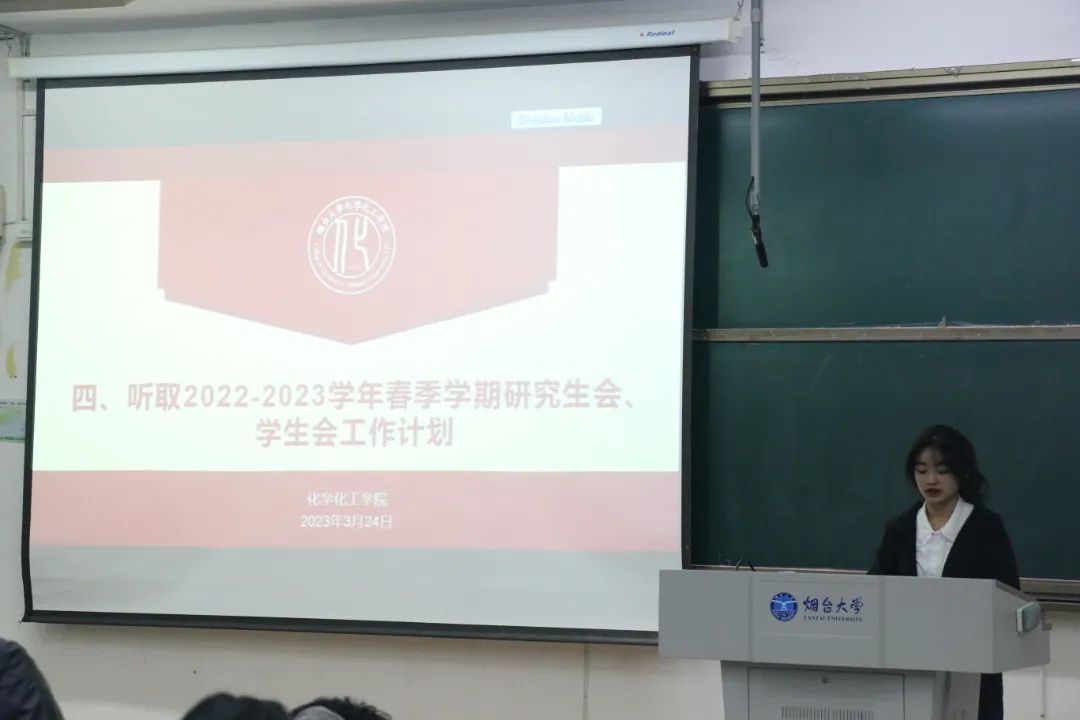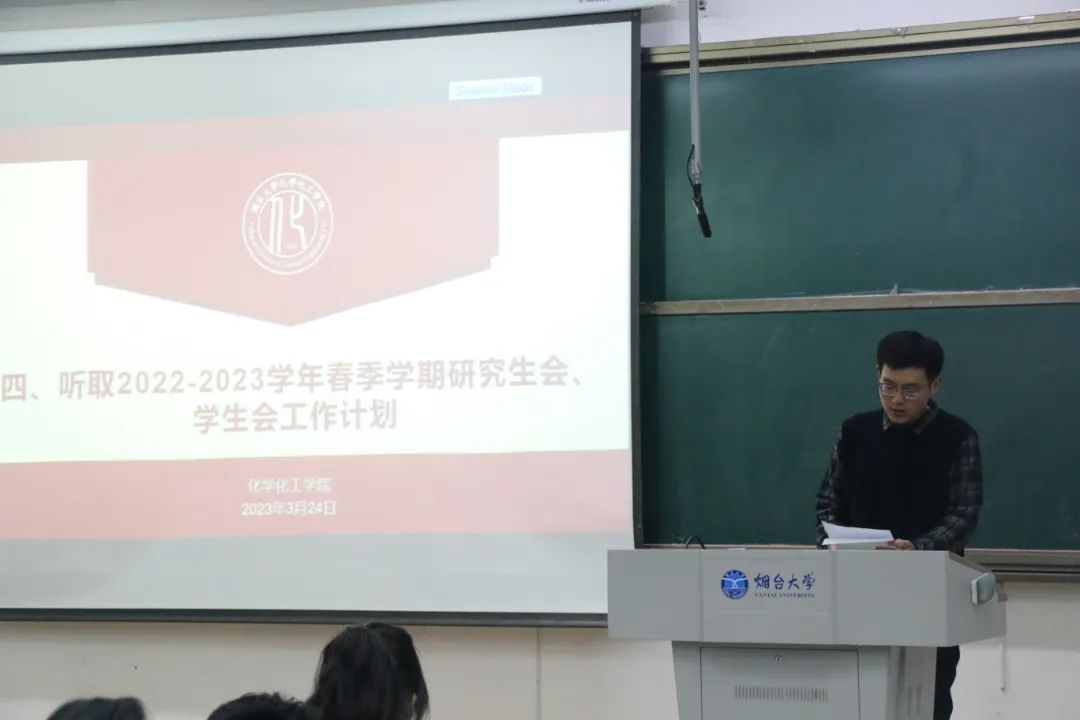 学院研究生会副主席张新增同学代表学院2022届研究生会做了上学期工作总结,从“宿舍管理、安全意识、科研精神和学术交流”等方面对院研究生会本学期工作进行了规划和展望。他表示,未来院研究生会将继续做好各项工作,主动发挥“承接和带动”作用,发挥研究生在本科生和教师之间、专业学习和科研创新之间、个人兴趣和团队研究方面的“承接”作用,发挥研究生对本科生在学习、实践、科研、深造、创业等方面的“带动”作用。其后,院学生会副主席何施琪同学代表化院2022届学生会对上学期院学生会工作进行总结,并围绕“理想信念、服务同学、校园文化建设和改革创新”等方面,向代表们汇报了本学期院学生会的工作计划,体现了学生会全心全意为同学服务的宗旨。