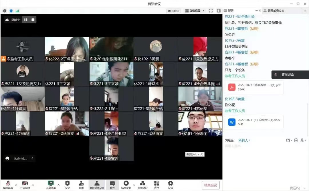 考试前,线下同学们有序进入考场,主动将手机和备考资料等整齐地放在规定位置,在讲台前抽取自己座位号码,接着坐到相应位置并在《诚信考试承诺书》上签字。线上同学则在志愿者的引导下进入腾讯会议室,采取双机位考试模式。随后,各班学习委员宣读了《诚信考试承诺书》,紧接着在领誓人的带领下,线上线下全体同学起立,举起右拳,庄严宣誓:“牢记师长嘱托,不负烟大厚望;认真规范答题,严守考场纪律;守住人生底线,公平参与竞争;珍惜人格名誉,做光荣化院人!”在响亮又庄严的宣誓声后,考试时间到,各考场负责人按时发放试卷后离开考场。