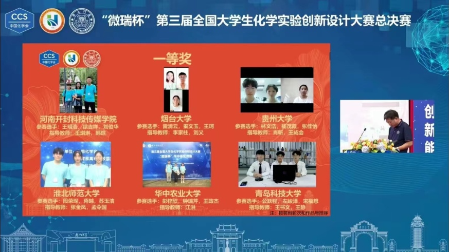 本次大赛历时一个多月,分为区域决赛和全国总决赛两个阶段。共有全国410余所高校的908支学生队伍分别在华中、华东、华南、华北、东北、西北、西南7个分赛区参加了区域决赛,最后选出90支队伍入围全国总决赛。我校派出的3支学生队伍发挥出色通过初评,参加了7月中旬在北京师范大学举办的华北赛区决赛。其中,我院教师李家柱、刘义老师指导本科生雷清云、秦文玉和王珂设计的作品《重氮盐合成实验的改进与拓展》,刘珊珊、何涛老师指导本科生朱亚茹、菅金成和刘洪浩设计的作品《软包“LiFePO4-Zn”锂离子电池的制备及其性能表征》获得华北赛区一等奖;刘振波、焉炳飞老师指导本科生贾文萱、李天愉和肖佳月设计的作品《荧光探针量子产率的测定》获得华北赛区二等奖,创造了我校在此项赛事中的历史最好成绩。最终,李家柱、刘义老师指导的由本科生雷清云、秦文玉和王珂设计的作品《重氮盐合成实验的改进与拓展》被推选代表华北赛区参加全国总决赛并最终荣获一等奖。