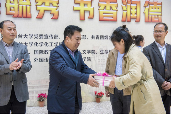 副校长孙祥斌代表学校向本届读书节赠送《北大清华名师演讲录》和烟台大学编写的名誉校长张承先文集。