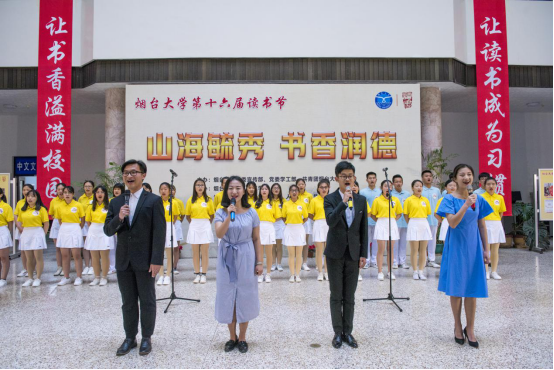 开幕式最后,烟台大学“领读者”和音乐舞蹈学院学生代表及化学化工学院合唱团带来朗诵与合唱《我和我的祖国》,表达了烟大学子“为中华之崛起而读书”的决心与信念。