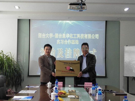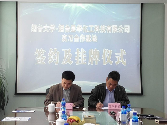 4月23日,烟台大学实习基地协议签订及挂牌仪式在烟台显华化工科技有限公司总部进行,副院长李文佐代表学校与烟台显华化工科技有限公司董事长兼总经理丰佩川共同签订“烟台大学实习合作基地建设协议书”,并进行授牌仪式。烟台显华化工科技有限公司各相关部门负责人,学院教师何涛、李兴存、李家柱、林清泉、杨树斌出席仪式。