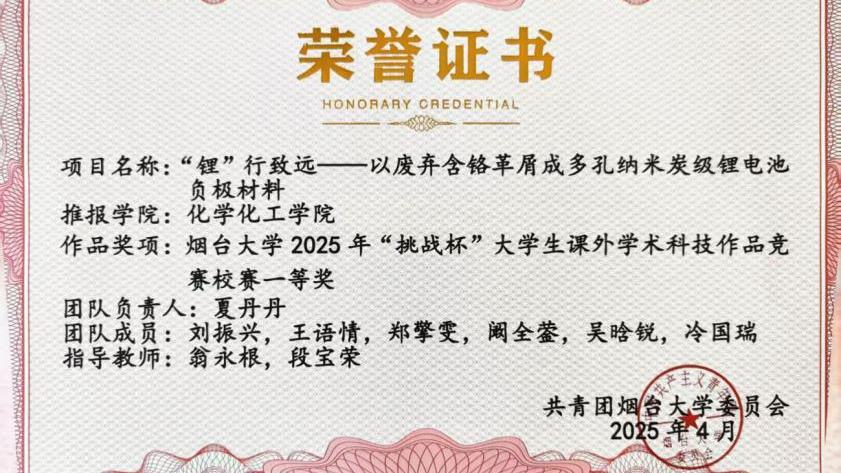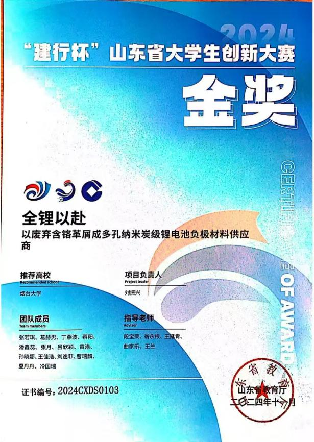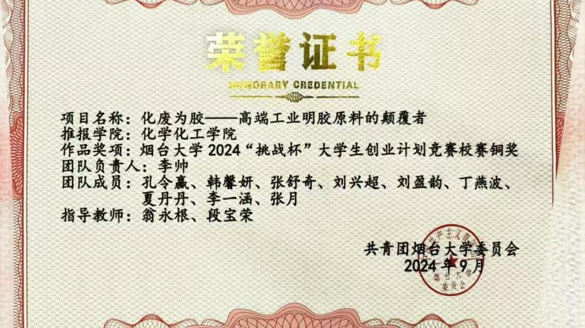 曾获得山东省大学生高分子材料创新设计大赛二等奖、中国国际大学生创新大赛银奖、建行杯”山东省大学生创新大赛铜奖、第五届全国高分子材料创新创业大赛铜奖等奖项。